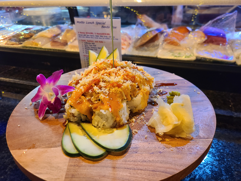 Sushi is made of small pieces of raw fish that are wrapped in rice and seaweed. The seaweed, called nori, is collected with submerged bamboo nets. … The sushi chef chops off small bits of the fish and combines them with spices such as ginger root. Wasabi and soy sauce are commonly used to flavor sushi rolls.
